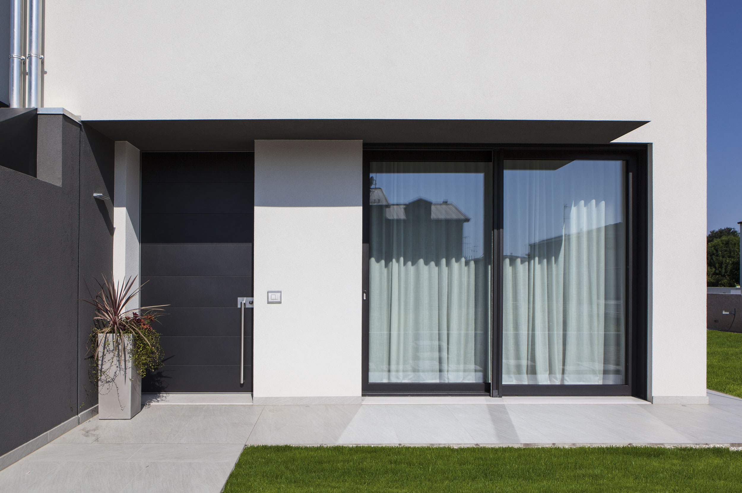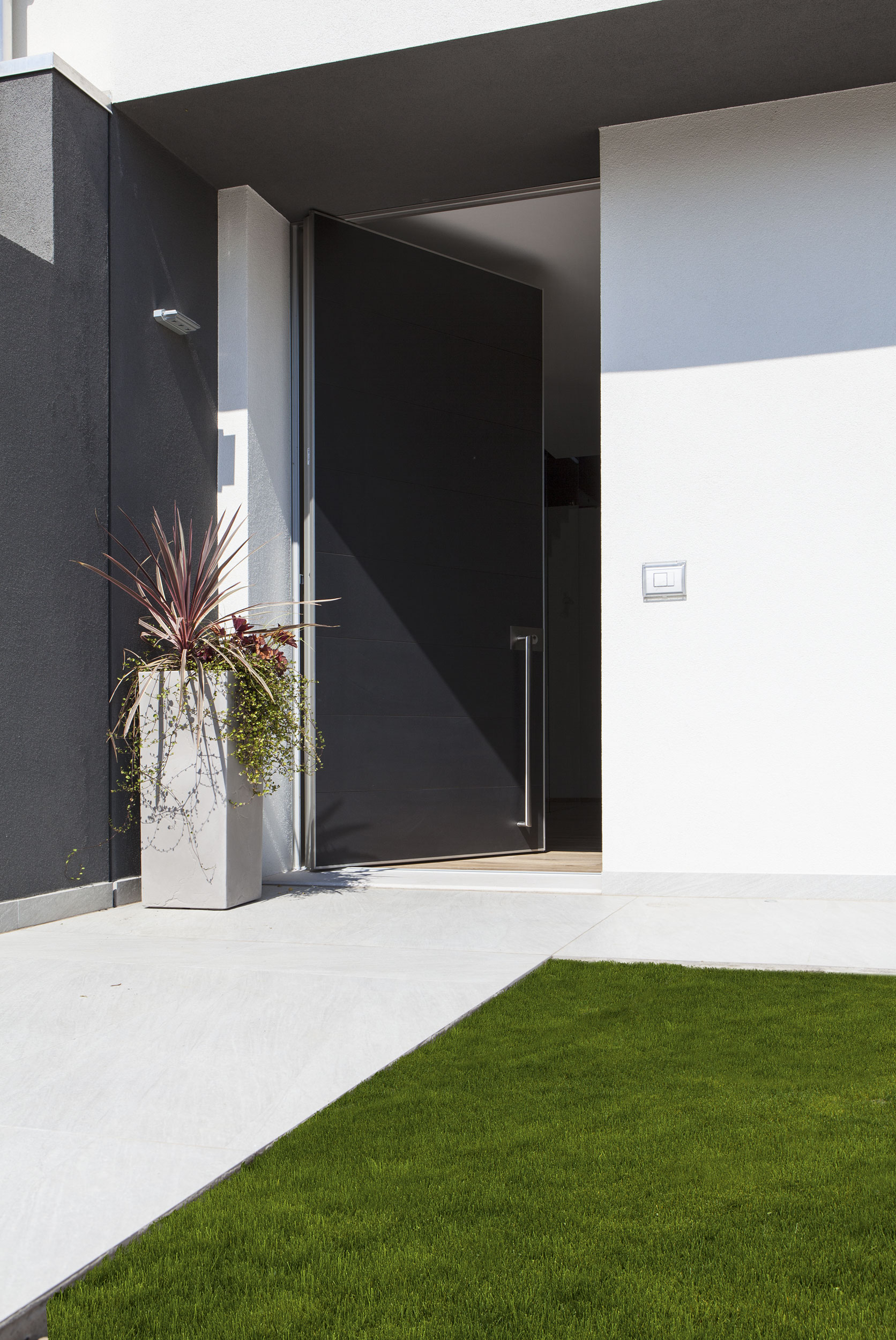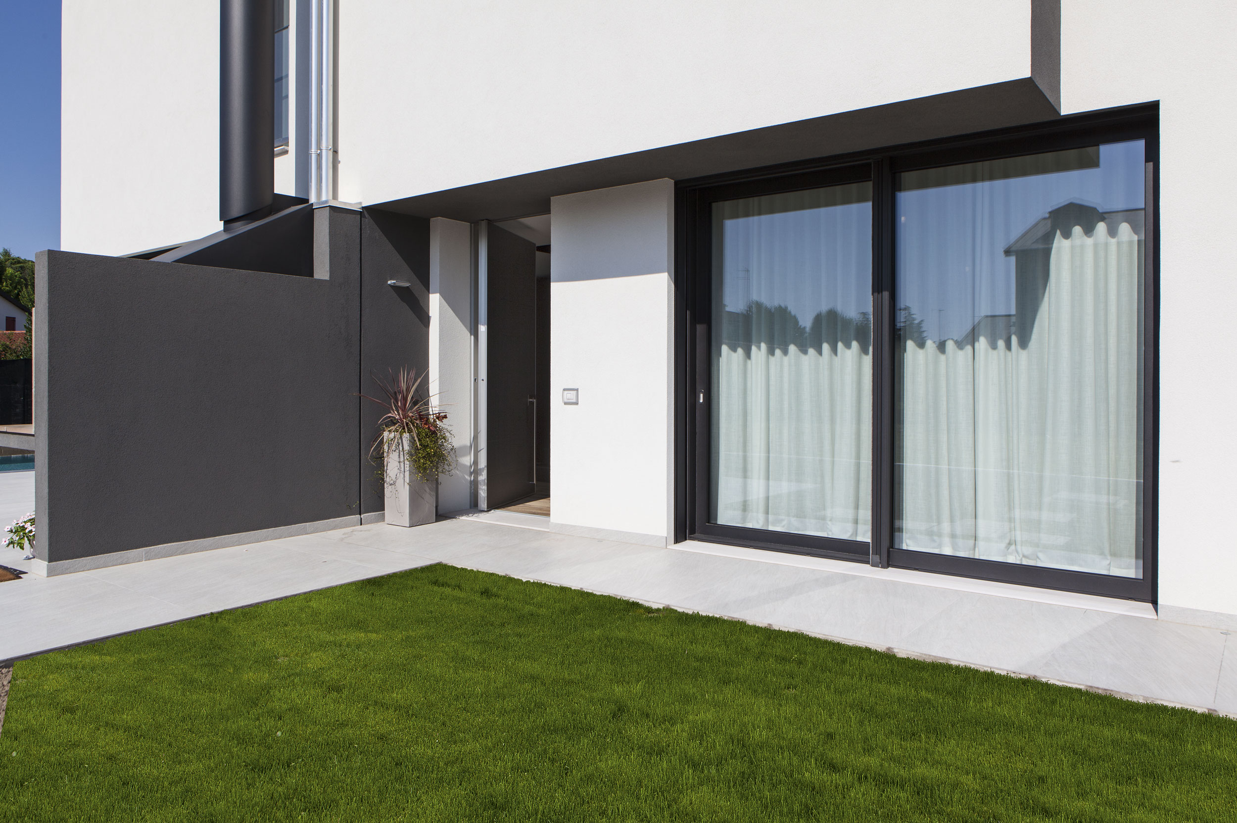 L’ingresso è stato realizzato con un sistema a bilico Synua, caratterizzato da un profilo unico. La finitura esterna, in alluminio verniciato coordinato con gli infissi, conferisce unicità ed eleganza all’ingresso. La finitura interna, raffinata in laccato bianco, aggiunge ulteriore prestigio all’entrata della residenza.