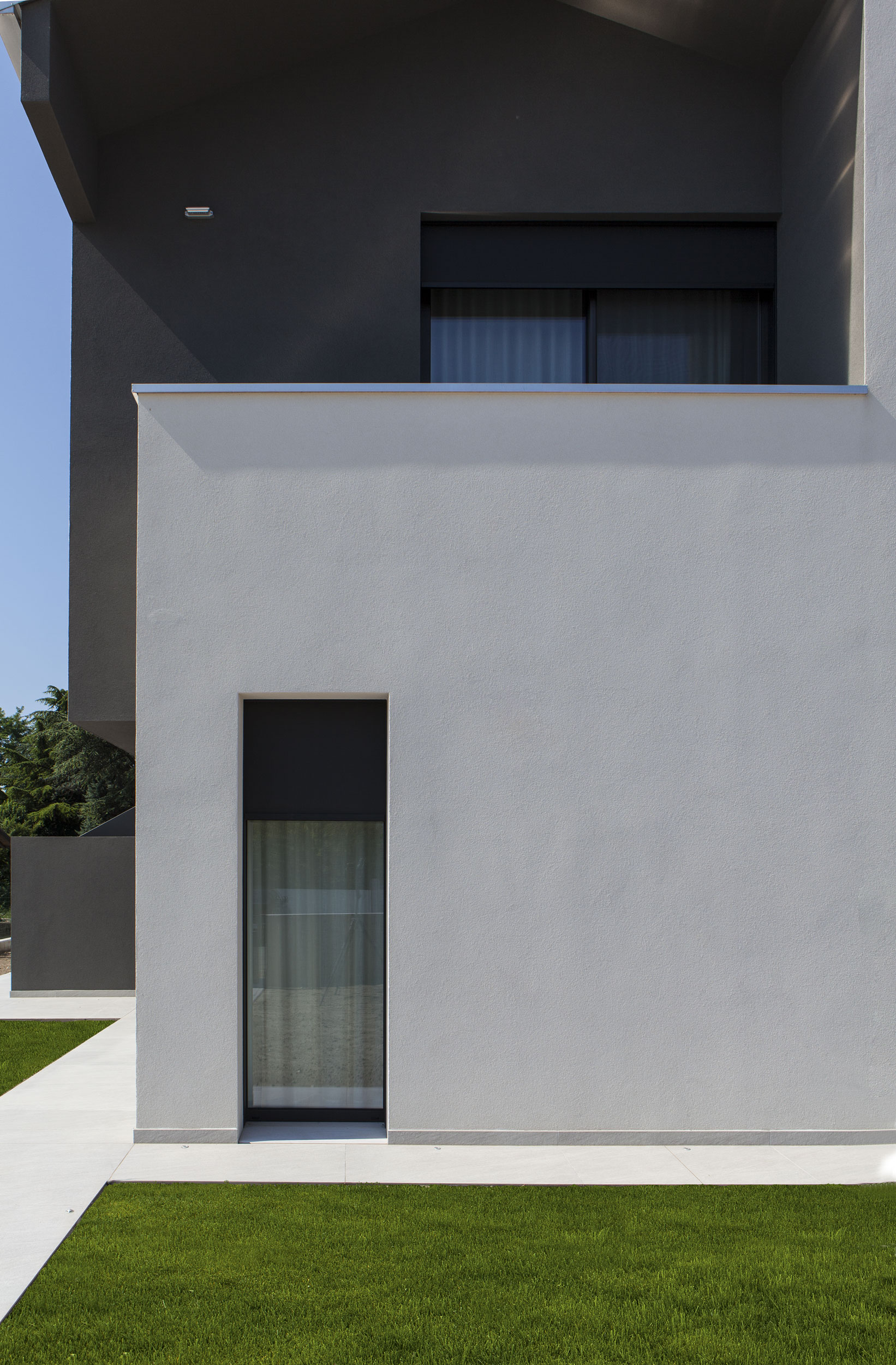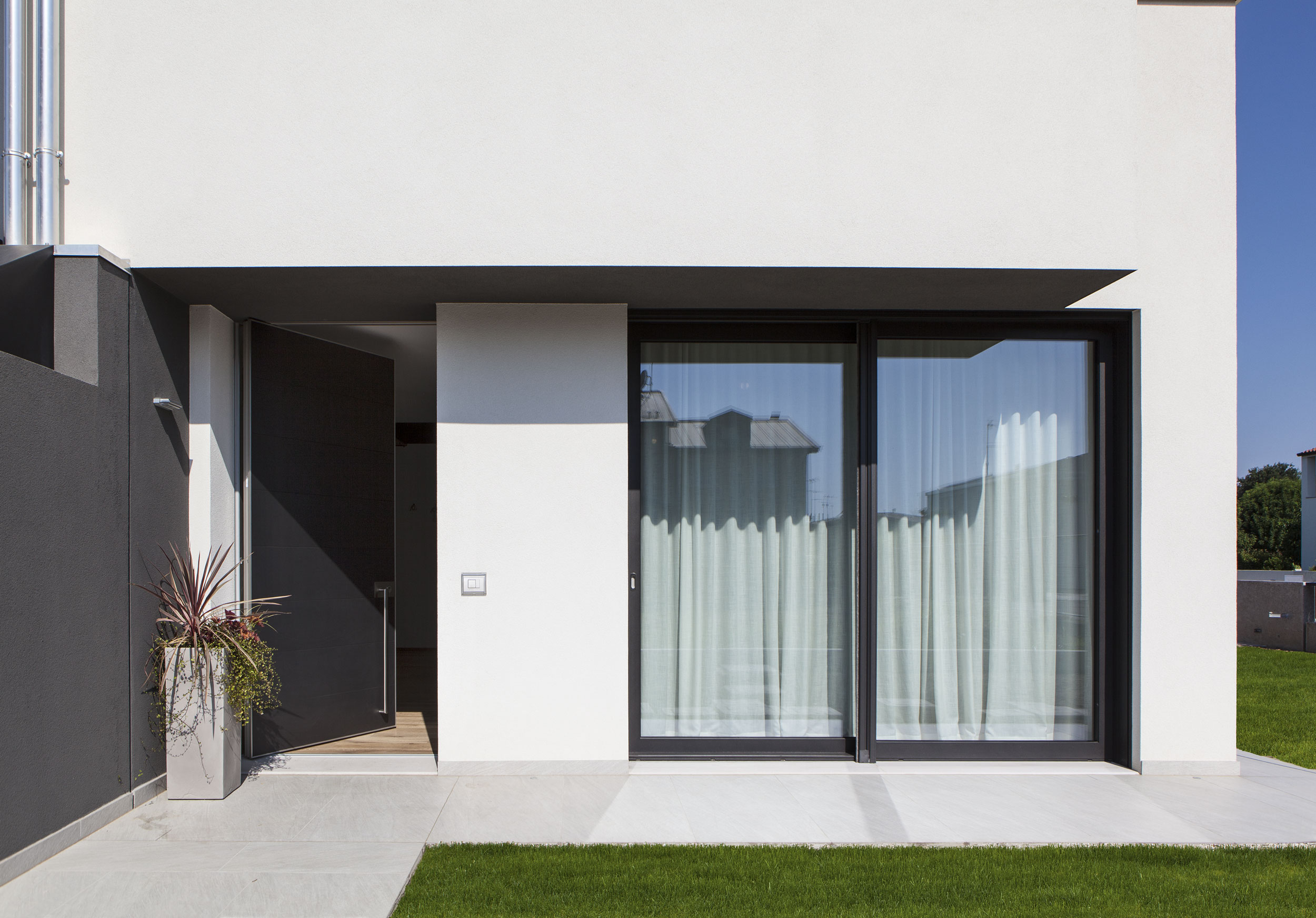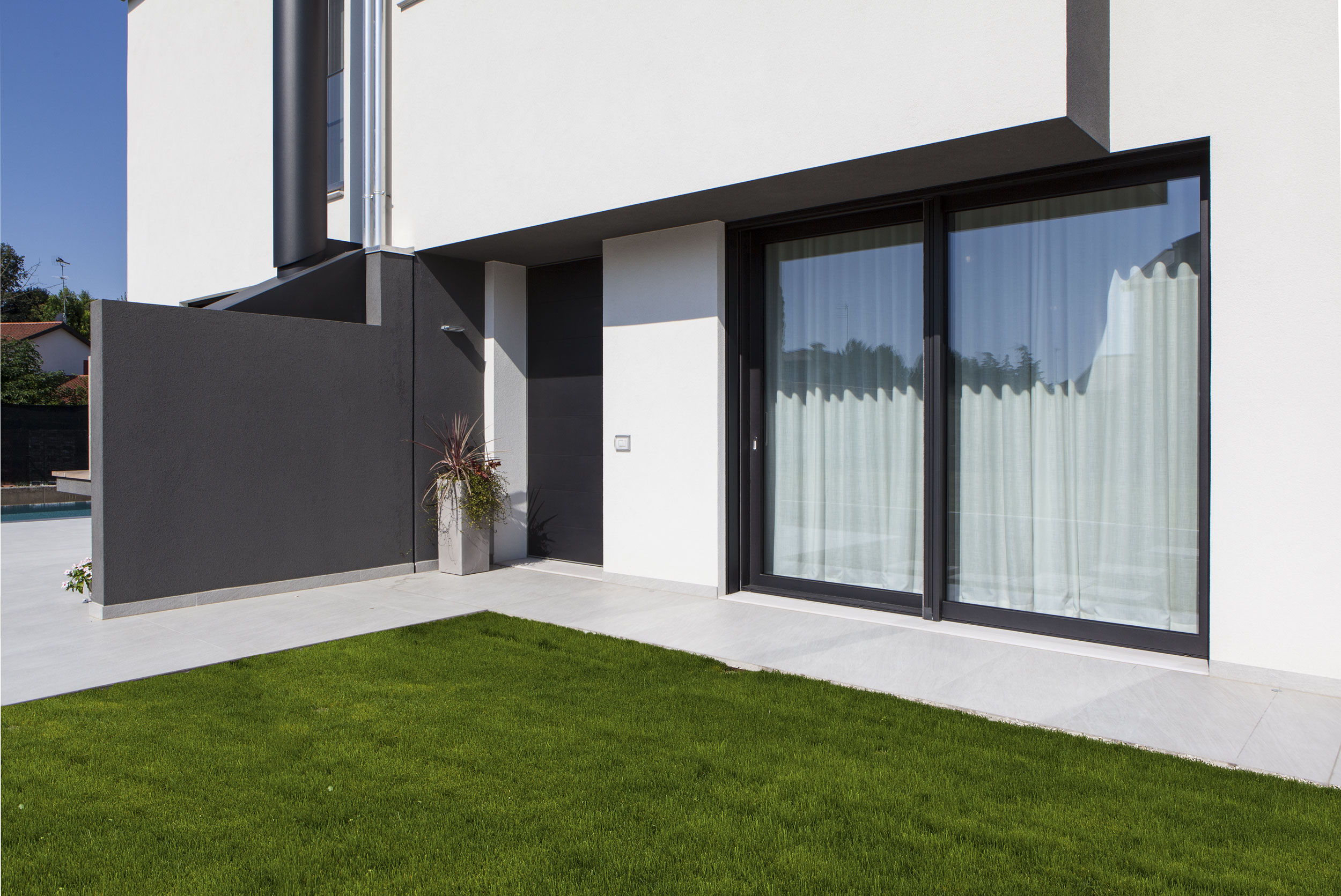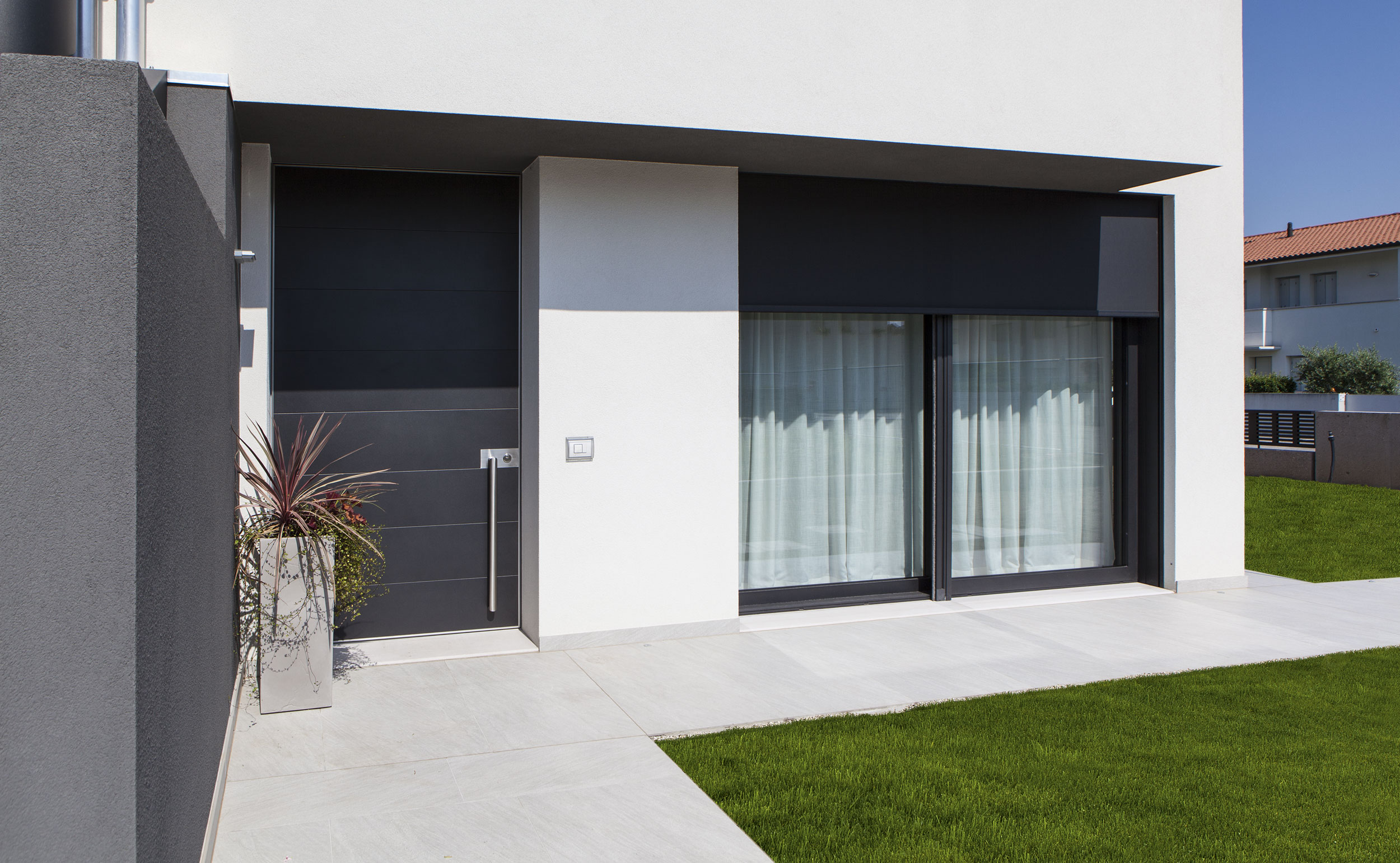 L’ingresso è stato realizzato con un sistema a bilico Synua, caratterizzato da un profilo unico. La finitura esterna, in alluminio verniciato coordinato con gli infissi, conferisce unicità ed eleganza all’ingresso. La finitura interna, raffinata in laccato bianco, aggiunge ulteriore prestigio all’entrata della residenza.