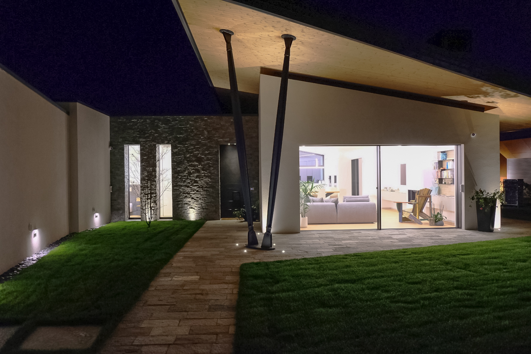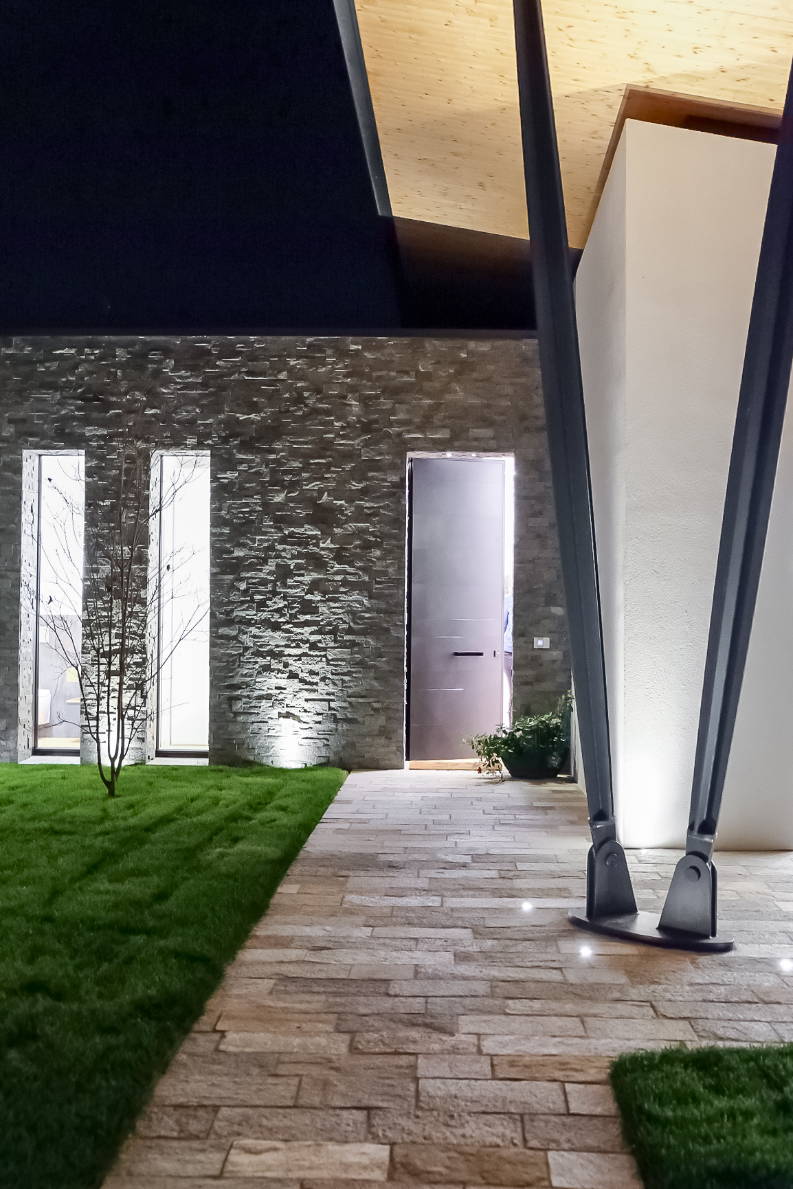 L’ingresso è stato realizzato con un rivestimento in Laminam Ossido Nero, che si abbina perfettamente alla scelta dei materiali esterni.