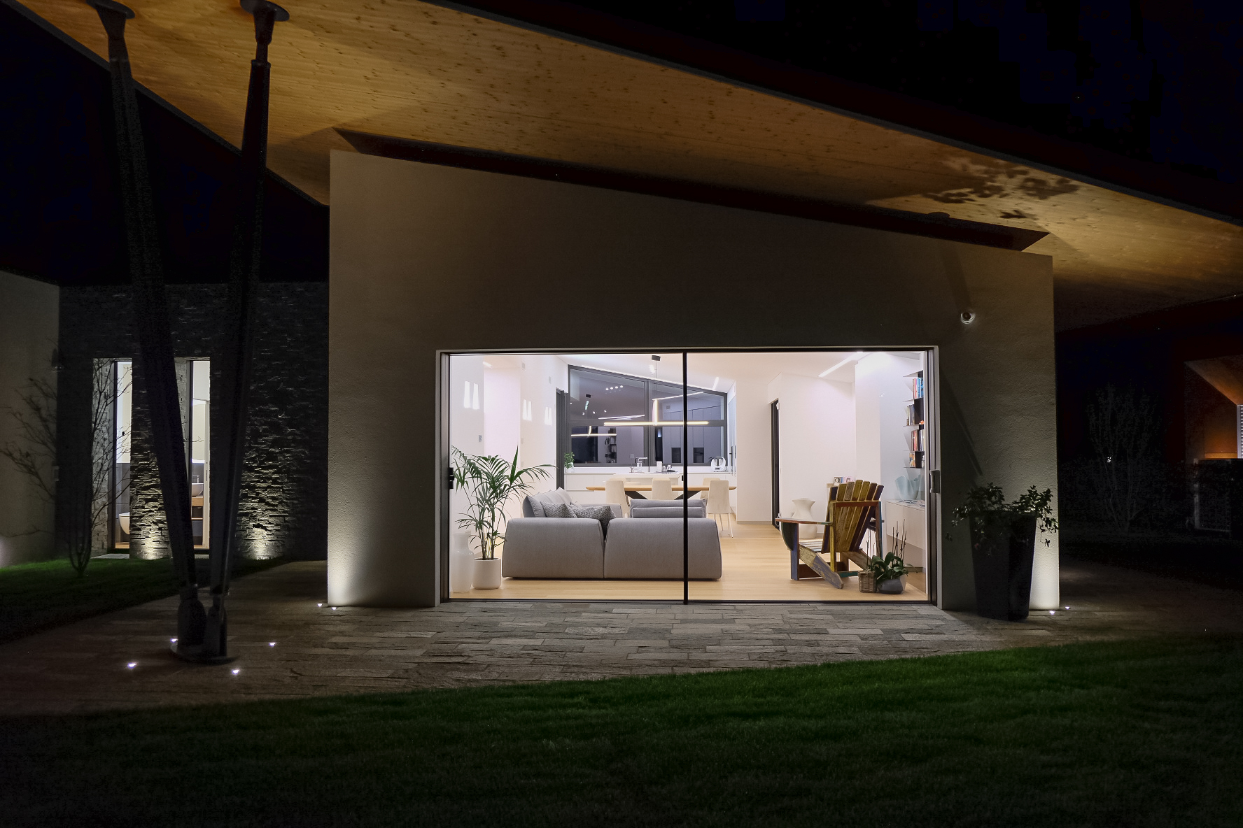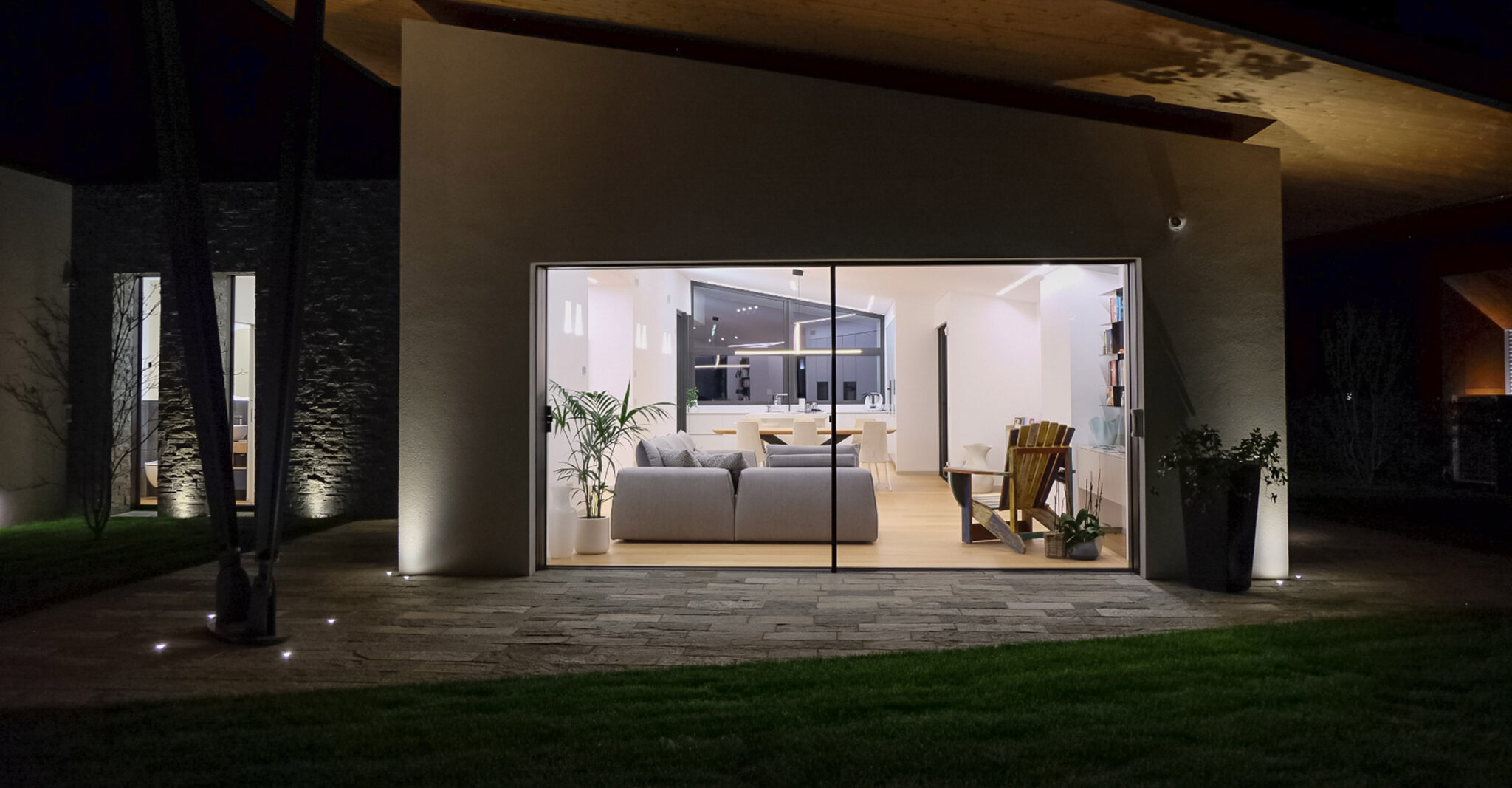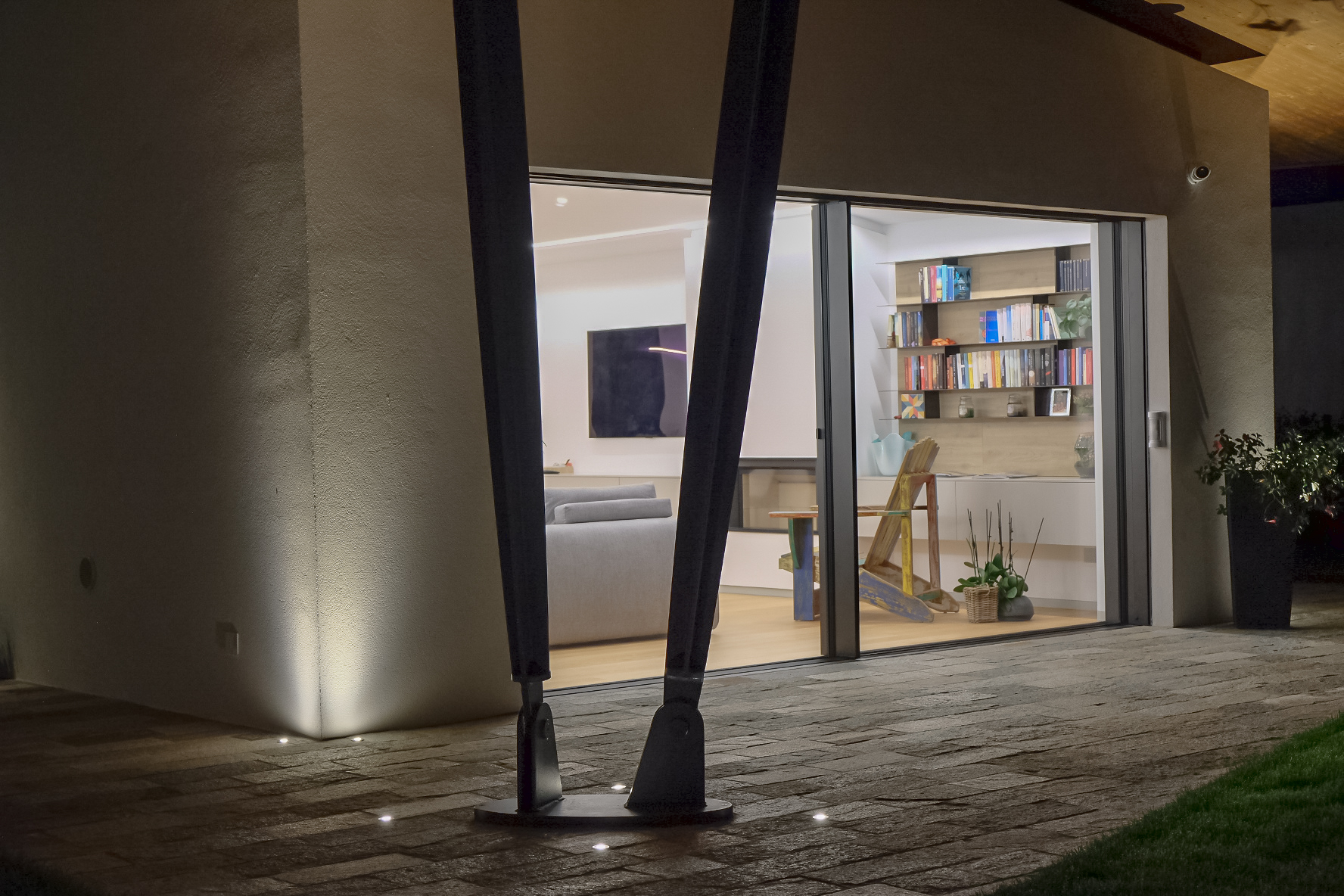 Il sistema di infissi nella zona giorno è stato realizzato su misura: l’inserimento degli infissi nell’inclinazione della parte sovrastante rappresenta un’elemento di unicità, creando continuità tra l’ambiente interno ed esterno. Le aperture, in questo contesto, sono totalmente motorizzate e a scomparsa.