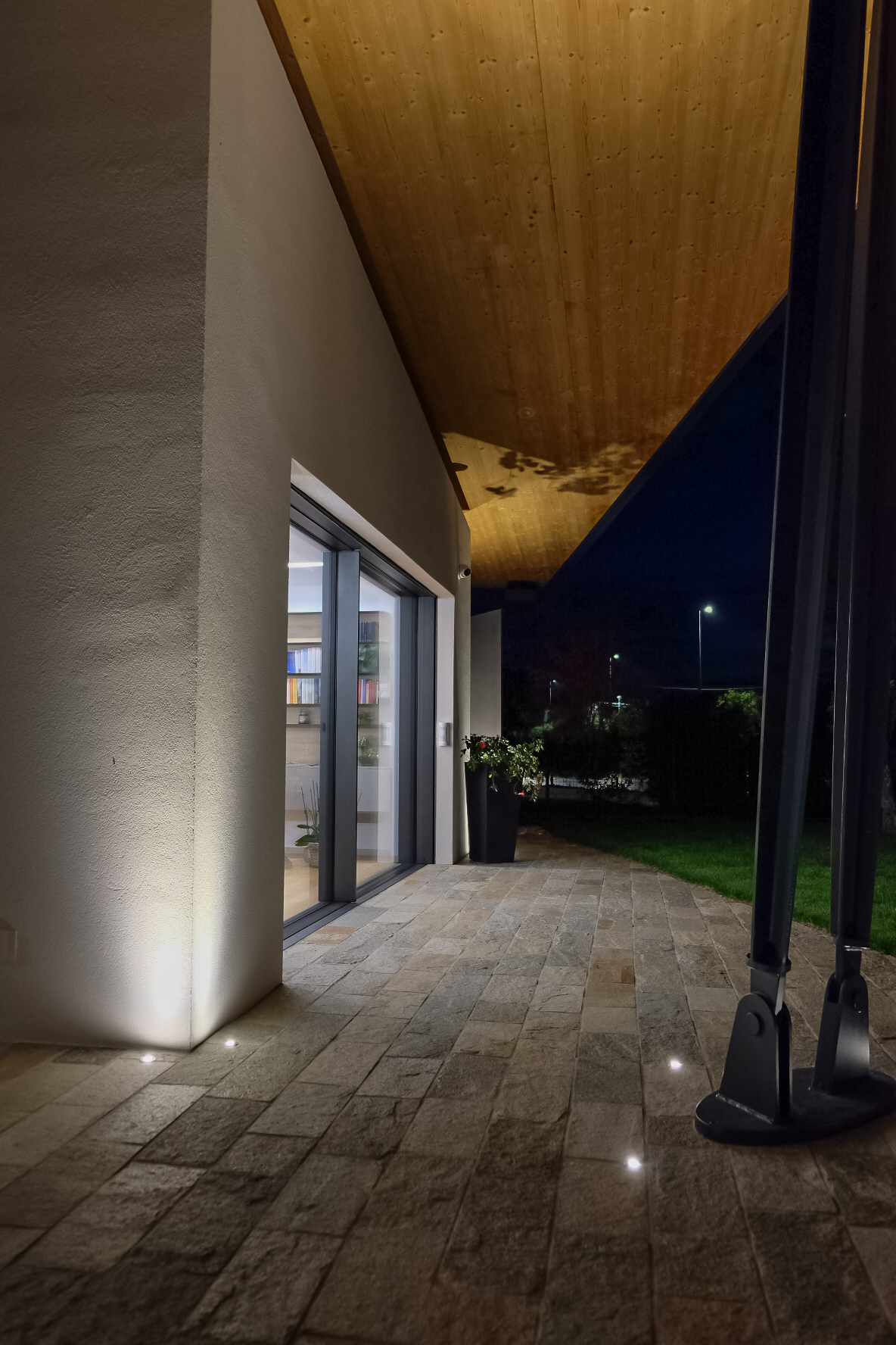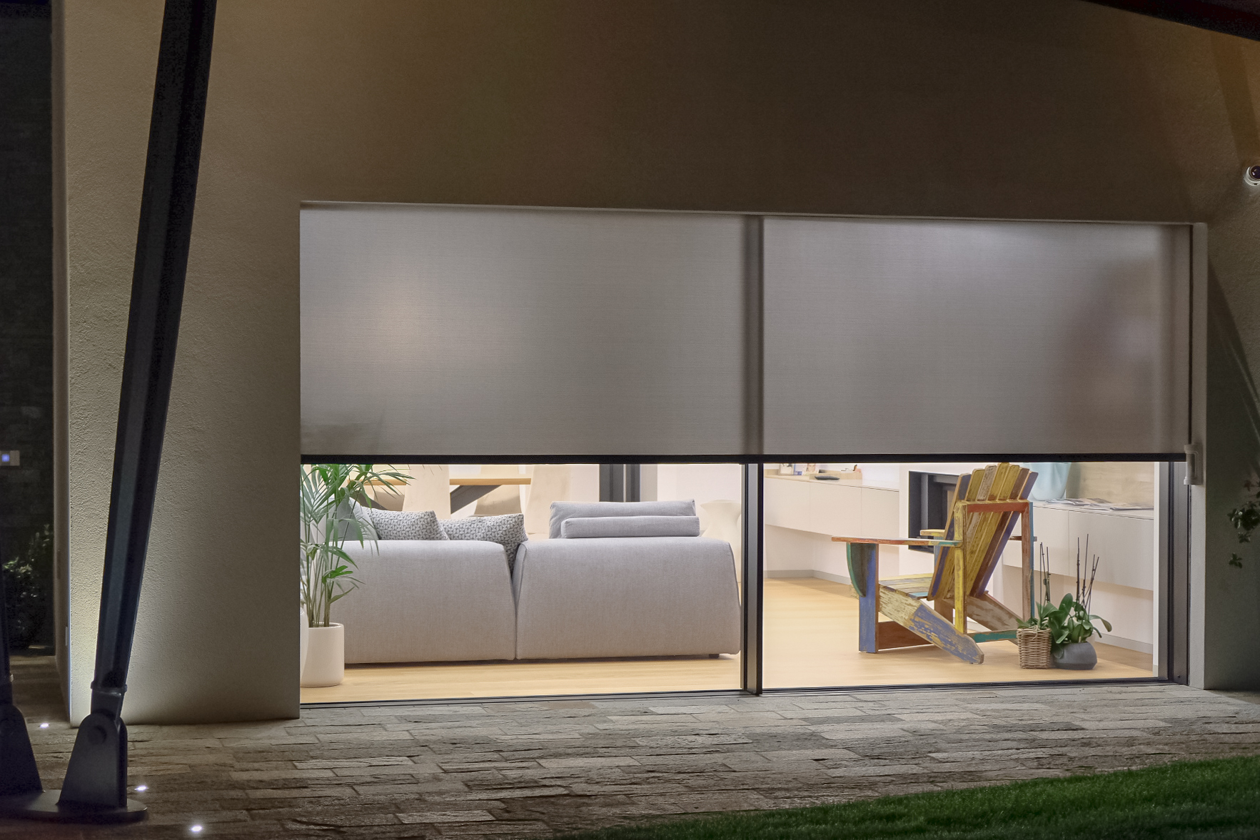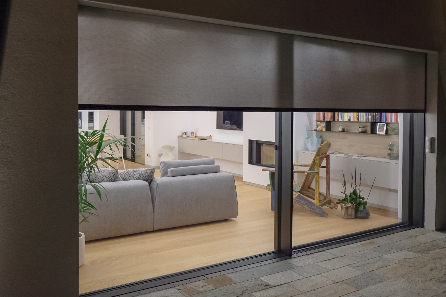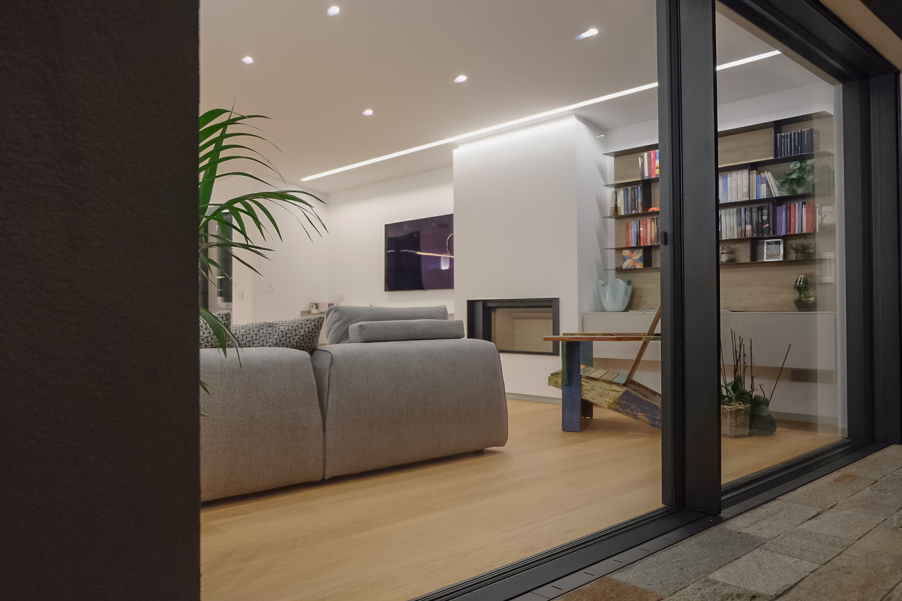 Il sistema di infissi nella zona giorno è stato realizzato su misura: l’inserimento degli infissi nell’inclinazione della parte sovrastante rappresenta un’elemento di unicità, creando continuità tra l’ambiente interno ed esterno. Le aperture, in questo contesto, sono totalmente motorizzate e a scomparsa.