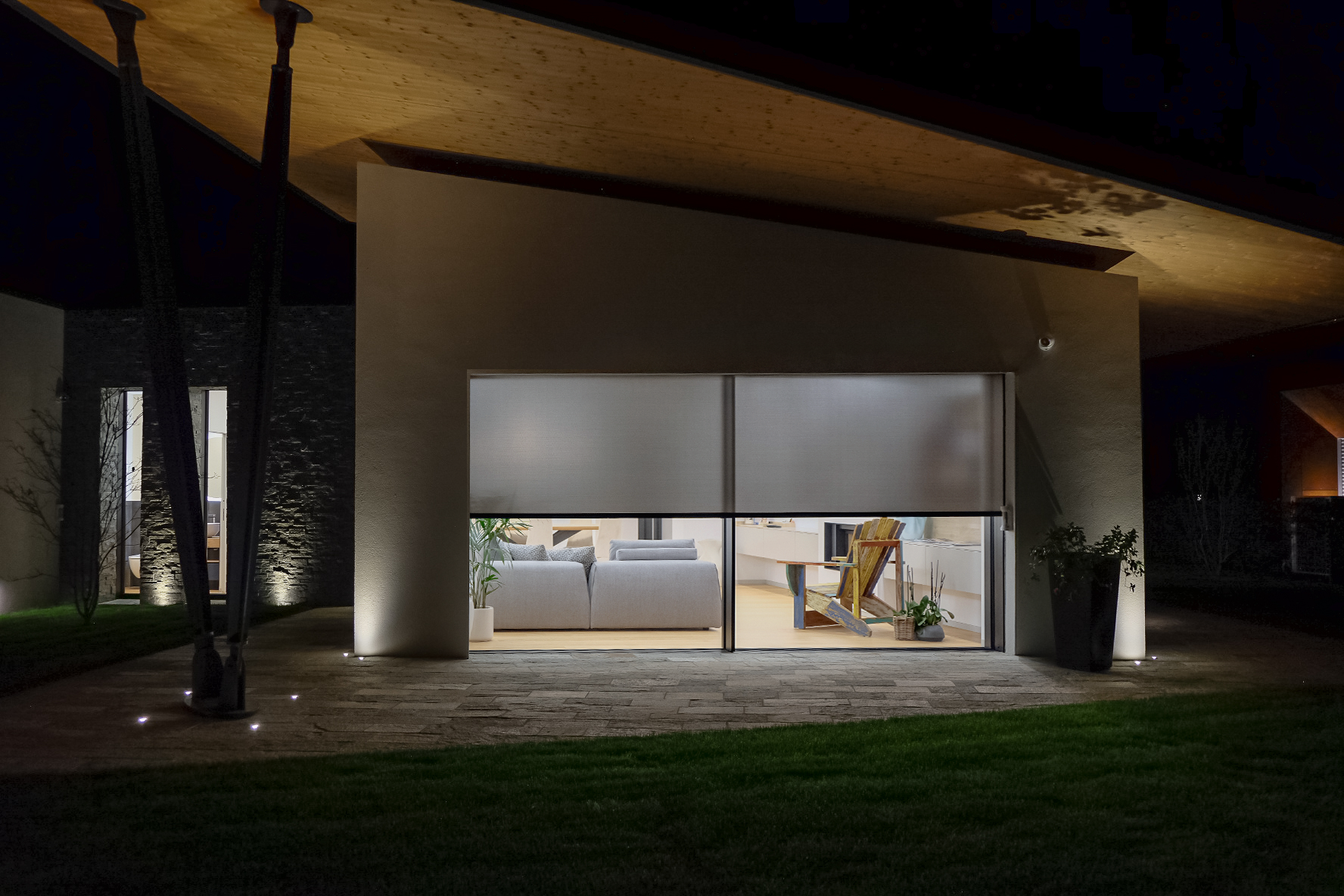 La richiesta della direzione lavori è di un sistema completamente panoramico, in cui lo sviluppo verticale di tutti gli infissi (h 2700 mm) garantisce linearità con la grande falda inclinata. La vetrata principale e tutti gli scorrevoli della zona notte sono caratterizzati dalla visione del solo vetro e da un profilo centrale di 30 mm; tutti i sistemi oscuranti sono integrati nella muratura.
